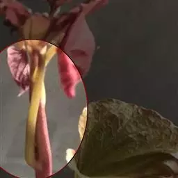 由白绢病病菌引起的南方枯萎病症状:白绢病病菌可以侵染植株的一部分,但是在叶片和茎部最容易观察到。最初,茎段与介质接触的地方有水渍状病斑,另一个症状叶片表面或基质上长出扇圆形的霉状物,起初是白色的,以后随着发育变成黑褐色。尤其是在温暖的若植株受了感染,则很容易导致插条的腐烂。