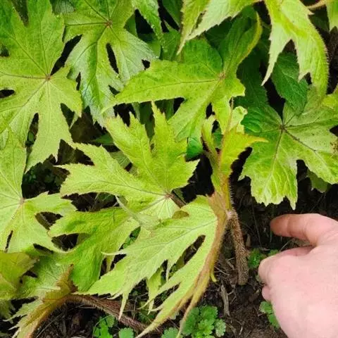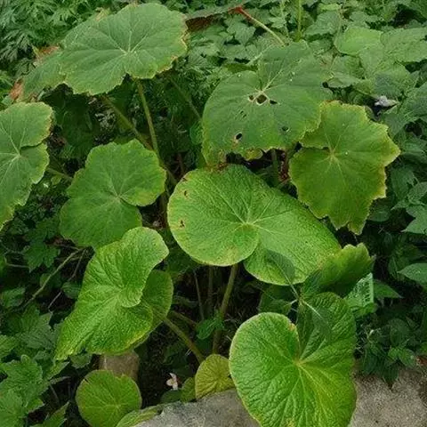 叶均基生,具长柄;叶片两侧极不相等,轮廓卵状圆形或近圆形,长8-10厘米,宽5.5-7.5厘米;先端急尖,基部深心形,窄侧宽约2-3厘米,宽侧宽约4厘米,向下延伸约3厘米,边缘有疏而浅不规则钝锯齿,上面深绿色,下面色淡,被小圆形突起,掌状脉,下面明显呈深紫色,窄侧3条,宽侧5条,近中部呈羽状;叶柄长7.5-9厘米,粗而扁,两侧边呈膜质,无毛;托叶卵形,长7-9毫米,无毛。