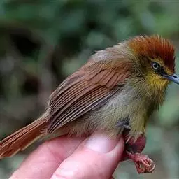 红翅薮鹛是噪眉科、薮鹛属中型鸟类,体长21-24厘米。头顶灰褐色,头侧和颈侧赤红色,上体橄榄褐色,…