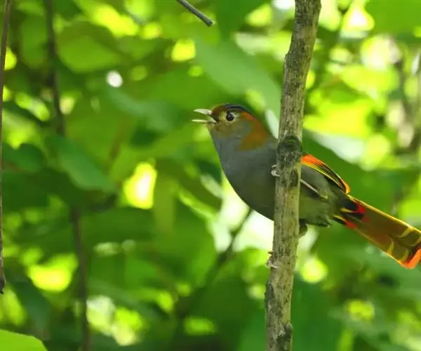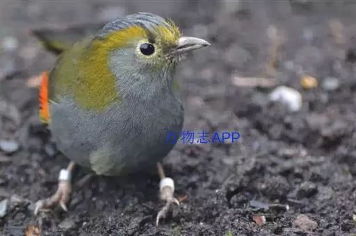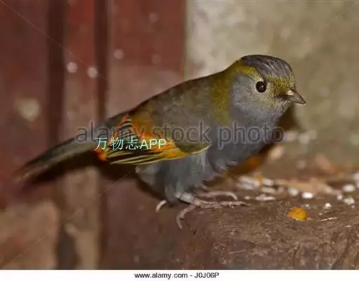 体型略小(17厘米)的薮鹛。上体灰橄榄色,下体及脸侧灰色。额、眉纹及颈侧橄榄黄色。具明显的橙色翼斑,初级飞羽及三级飞羽黑色,羽缘黄色。方形的尾橄榄色而带黑色横斑,尾端红色。外侧尾羽羽缘黄色,尾端偏红。臀近黑,羽尖橘黄。雌鸟的尾及翼羽无红色羽缘。 虹膜-褐色;嘴-褐色;脚-褐色。