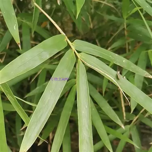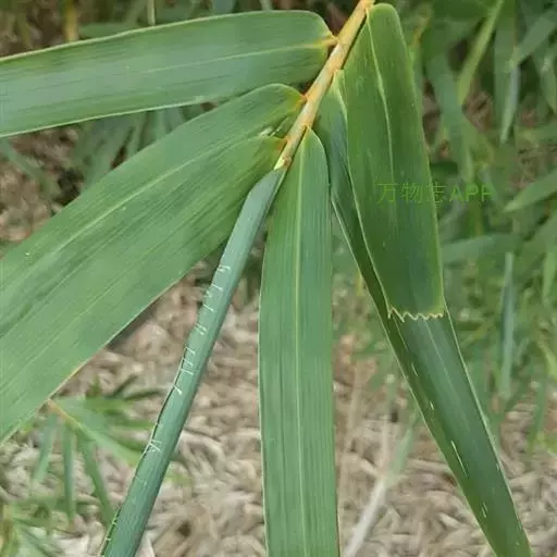 竿箨幼时薄被白蜡粉,早落;箨鞘呈梯形,背面无毛,先端稍向外缘一侧倾斜,呈不对称的拱形;箨耳极微小以至不明显,边缘有少许繸毛;箨舌高1-1.5毫米,边缘呈不规则的短齿裂;箨片直立,易脱落,狭三角形,背面散生暗棕色脱落性小刺毛,腹面粗糙,先端渐尖,基部宽度约与箨鞘先端近相等。末级小枝具5-12叶;叶鞘无毛,纵肋稍隆起,背部具脊;叶耳肾形,边缘具波曲状细长繸毛;叶舌圆拱形,高0.5毫米,边缘微齿裂;叶片线形,长5-16厘米,宽7-16毫米,上表面无毛,下表面粉绿而密被短柔毛,先端渐尖具粗糙细尖头,基部近圆形或宽楔形。