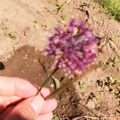 鳞茎数枚聚生,狭卵状圆柱形,粗0.3-1厘米;鳞茎外皮灰色至灰褐色,薄革质至革质,片状破裂。叶1-2枚,中空的管状,比花葶短,粗5-7(-10)毫米。花葶圆柱状,高15-70(-80)厘米,中部以下被光滑的叶鞘;总苞2裂,宿存;伞形花序半球状至近球状,具多而密集的花;小花梗近等长,比花被片长1.5-3倍,基部无小花苞片;花淡紫色;花被片卵状披针形至披针形,长4-8(-10)毫米,宽2-3毫米,等长,有时外轮的略短,具紫色中脉,先端具短尖头;花丝等长,等长于或略短于花被片,基部合生并与花被片贴生,合生部分高约1毫米,内轮花丝分离部分呈狭长三角形,基部约为外轮基部宽的1.5倍,外轮的锥形;子房卵球状,腹缝线基部具小的凹陷蜜穴;花柱伸出花被外;柱头点状。花果期6-9月。
