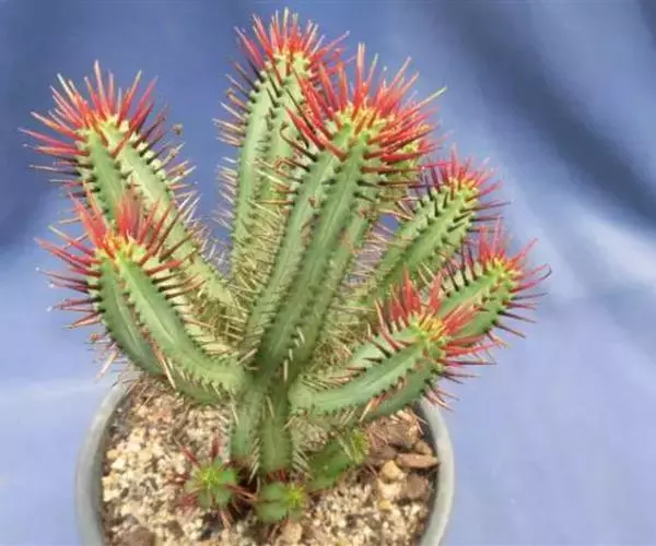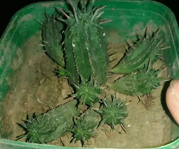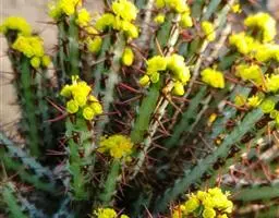 虎刺梅:别称铁海棠,是蔓生灌木植物。茎多分枝,长60-100厘米,直径5-10毫米,具纵棱,密生硬…