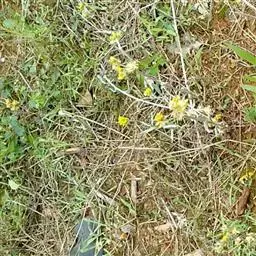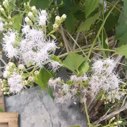 飞机草(学名:Eupatorium odoratum L.):是多年生草本植物,根茎粗壮,横走。茎直立,高1-3米,苍白色,有细条纹;分枝粗壮,常对生,叶对生,卵形、三角形或卵状三角形,花序下部的叶小,常全缘。头状花序多数或少数在茎顶或枝端排成复伞房状或伞房花序,总苞圆柱形,总苞片3-4层,覆瓦状排列,外层苞片卵形,麦杆黄色。花白色或粉红色。瘦果黑褐色,5棱,花果期4-12月。