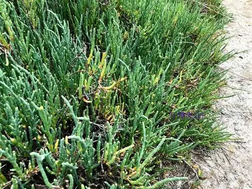 盐角草 一年生草本,高10-35厘米。茎直立,多分枝;枝肉质,苍绿色。叶不发育,鳞片状,长约1.5毫米,顶端锐尖,基部连合成鞘状,边缘膜质。