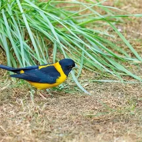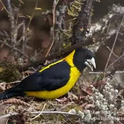 黄颈拟蜡嘴雀:小型鸟类,体长20-22厘米。嘴粗大,黑色。雄鸟整个头、颈、颏、喉和上胸辉黑色,…