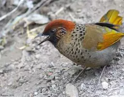点胸鸦雀(学名:Paradoxornis guttaticollis)是莺科、鸦雀属小型鸟类,体长18-21厘米。头顶至枕橙棕色,嘴橙黄色、短而粗厚,脸皮黄色,耳覆羽和颊后部黑色,眼圈白色。上体棕褐色。颏黑色,其余下体淡皮黄白色,喉和上胸具黑色矢状斑。虹膜黑褐色或栗色,脚蓝灰色。