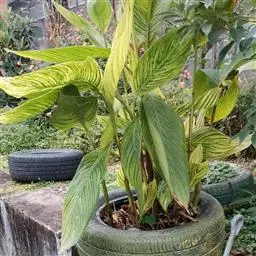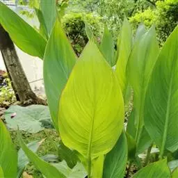 金脉美人蕉叶片淡黄色,叶脉绿化,叶缘具红边,全缘,大花美人蕉之变种