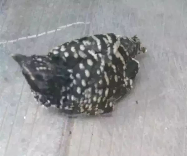 成年贵妃鸡,全身羽毛黑色为基调,白色飞花不规则的分布全身,白花以头部、颈部、胸部较密集;喙淡肉色,胫部肉粉色,有淡黑色斑点。尾部上翘,体态轻盈,步履缓慢,气质高贵。