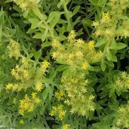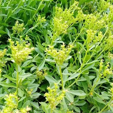 费菜(Sedum aizoon L.),景天科景天属多年生草本植物,根状茎短,粗茎高可达50厘米,直立。叶互生,叶坚实,近革质。聚伞花序有多花,萼片肉质,花瓣黄色,花柱长钻形。种子椭圆形,花果期6-9月。费菜分布广,多生长于山地林缘、灌木丛中,河岸草丛、较耐阴也较耐旱、较耐寒,在北方能露地越冬,对土壤无严格选择,适应性强。