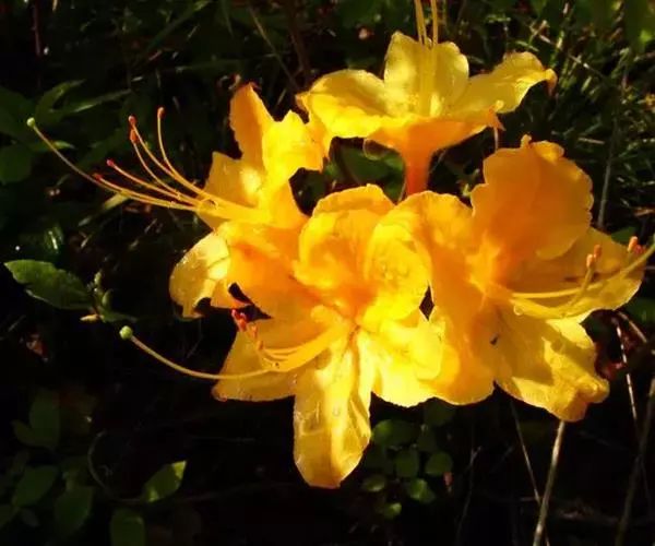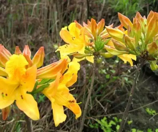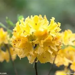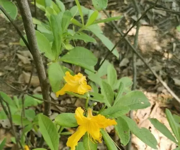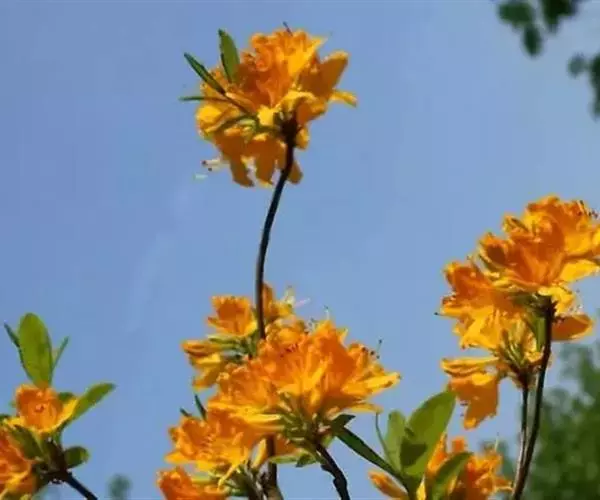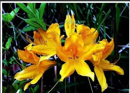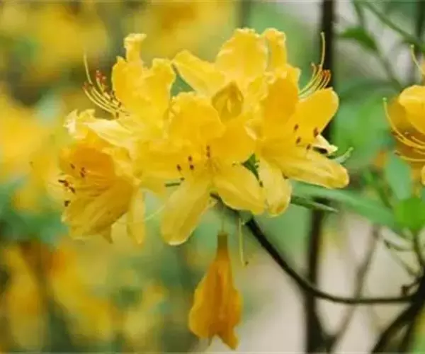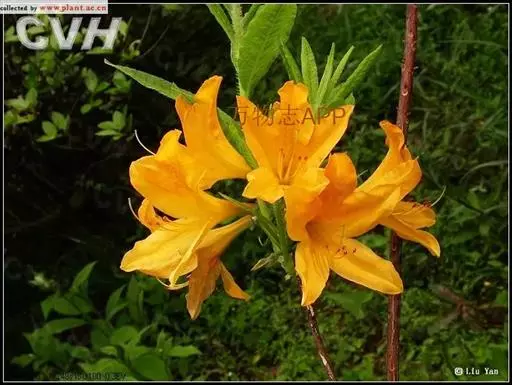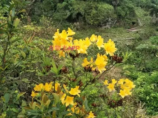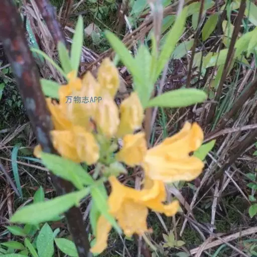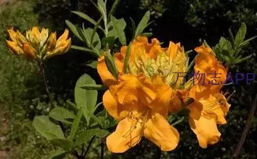 羊踯躅(学名:Rhododendron molle (Blume) G. Don ):落叶灌木,高0.5-2米;分枝稀疏,枝条直立,幼时密被灰白色柔毛及疏刚毛。叶纸质,长圆形至长圆状披针形,幼时上面被微柔毛,下面密被灰白色柔毛。总状伞形花序顶生,花多达13朵,先花后叶或与叶同时开放;花冠阔漏斗形,长4.5厘米,直径5-6厘米,黄色或金黄色,内有深红色斑点,花冠管向基部渐狭,圆筒状,长2.6厘米,外面被微柔毛,裂片5,椭圆形或卵状长圆形。蒴果圆锥状长圆形,具5条纵肋,被微柔毛和疏刚毛。花期3-5月,果期7-8月。