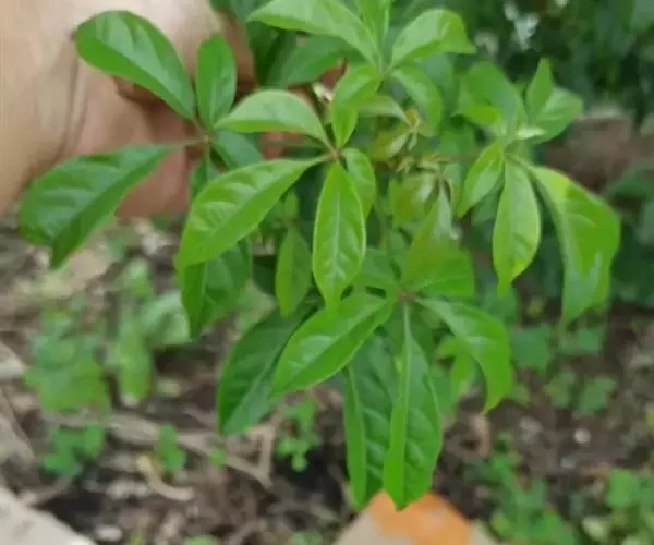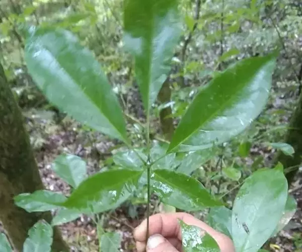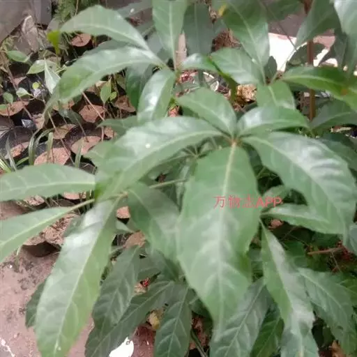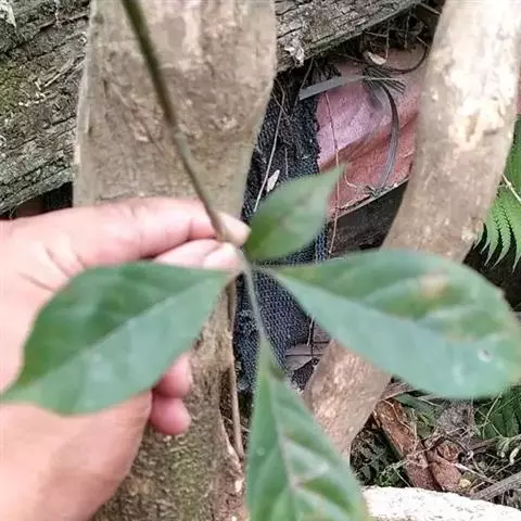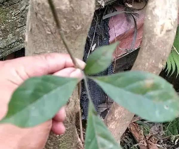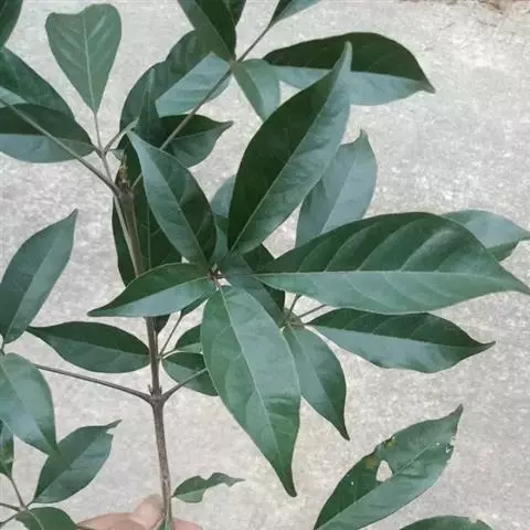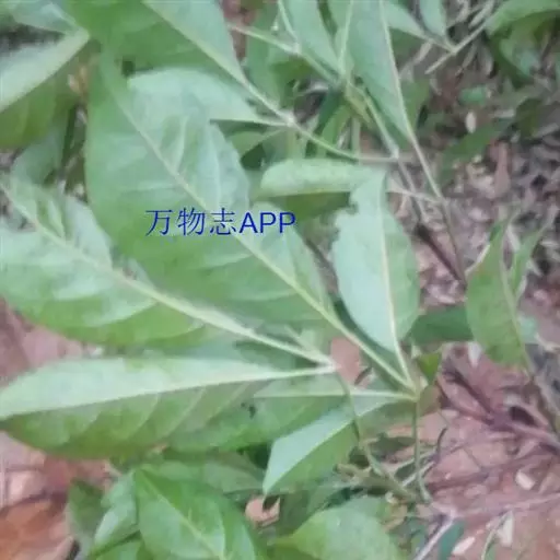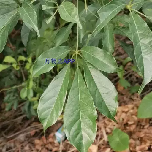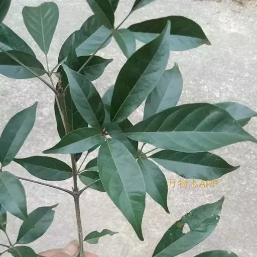 山牡荆 常绿乔木,高4-12米,树皮灰褐色至深褐色;小枝四棱形,有微柔毛和腺点,老枝逐渐转为圆柱形。掌状复叶,对生,叶柄长2.5-6厘米,有3-5小叶,小叶片倒卵形至倒卵状椭圆形,顶端渐尖至短尾状,基部楔形至阔楔形,通常全缘,两面除中脉被微柔毛外,其余均无毛,表面通常有灰白色小窝点,背面有金黄色腺点;中间小叶片长5-9厘米,宽2-4厘米,小叶柄长0.5-2厘米,两侧的小叶较小。
