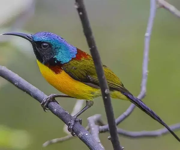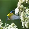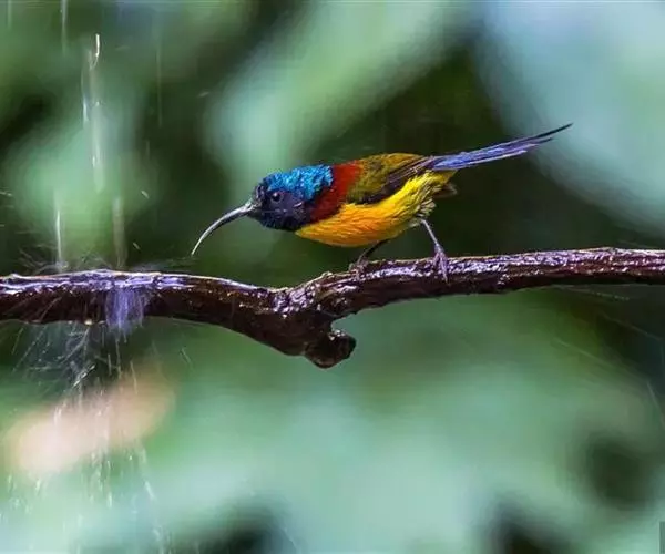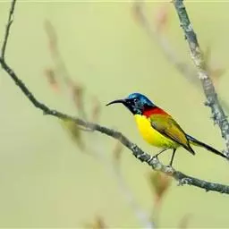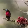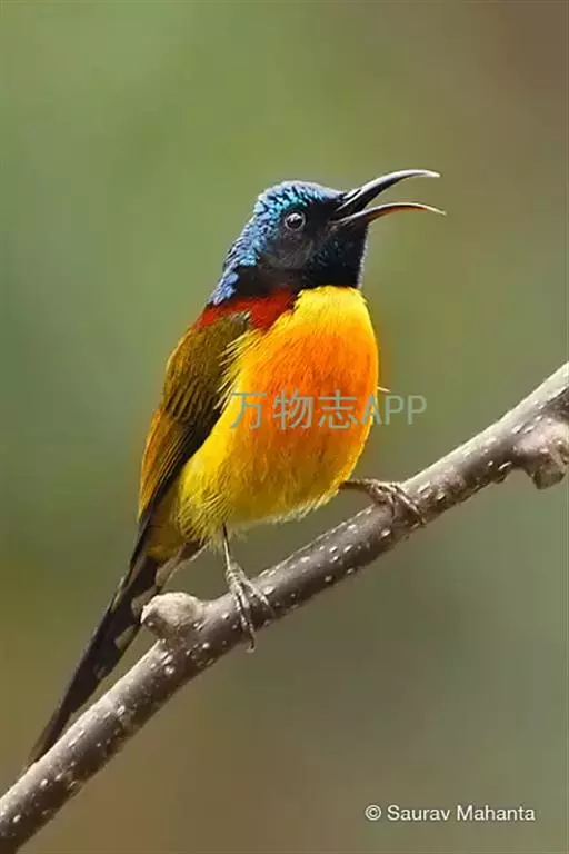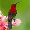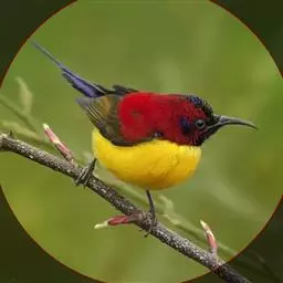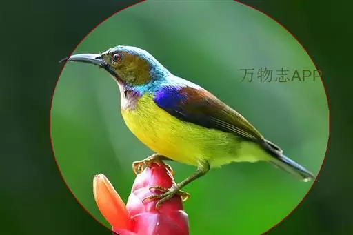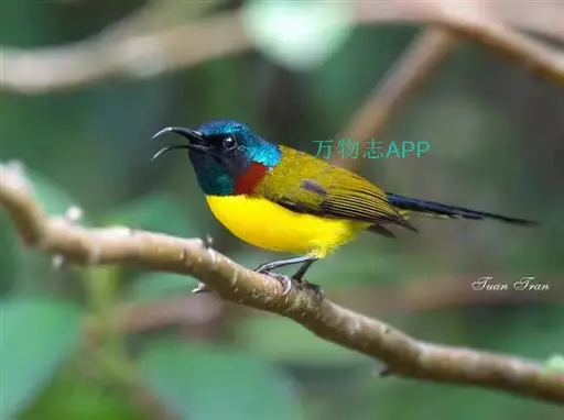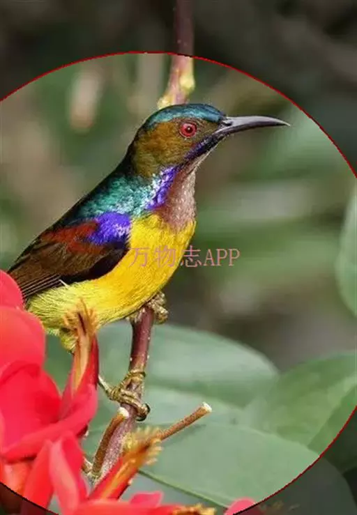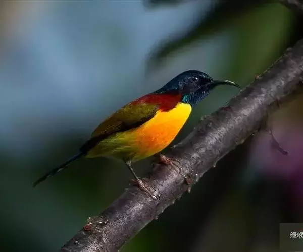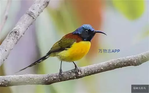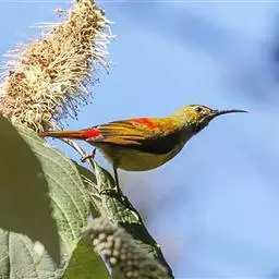绿喉太阳鸟(学名:Aethopyga nipalensis):共有9个亚种。小型鸟类,雄鸟体长13-15厘米、雌鸟10-12厘米。雄鸟前额至后颈、颏和喉辉绿色,头侧黑色,颈侧和背暗红色,两肩、下背橄榄绿色,腰鲜黄色,尾上覆羽和中央尾羽暗绿色,中央尾羽延长。胸黄色而杂有细的红色纵纹,其余下体黄绿色。雌鸟上体橄榄绿色、颏、喉淡灰绿色,其余下体淡黄色。