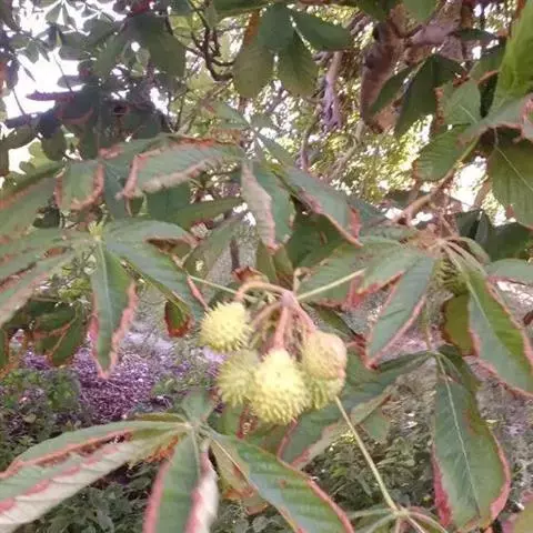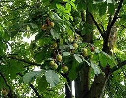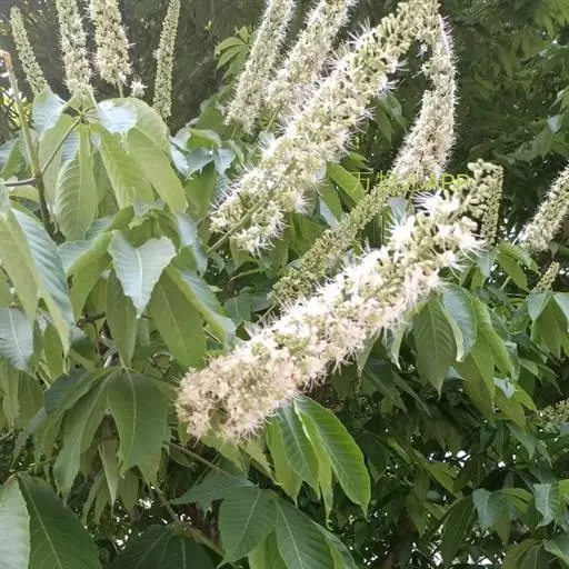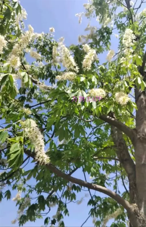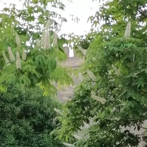 七叶树(学名:Aesculus chinensis Bunge):是落叶乔木,高达25米,树皮深褐色或灰褐色,小枝、圆柱形,黄褐色或灰褐色,有淡黄色的皮孔。冬芽大形,有树脂。掌状复叶,由5-7小组成,上面深绿色,无毛,下面除中肋及侧脉的基部嫩时有疏柔毛外,其余部分无毛。花序圆筒形,花序总轴有微柔毛,小花序常由5-10朵花组成,平斜向伸展,有微柔毛。花杂性,雄花与两性花同株,花萼管状钟形,花瓣4,白色,长圆倒卵形至长圆倒披针形。果实球形或倒卵圆形,黄褐色,无刺,具很密的斑点。种子常1-2 粒发育,近于球形,栗褐色;种脐白色,约占种子体积的1/2。花期4-5月,果期10月。