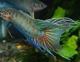 叉长为体高5.8~6.5倍,为头长4.5~4.8倍。头长为吻长2.7~2.9倍,为眼径4.9~6.1倍。 体延长,侧扁,背缘和腹缘浅弧形,以第二背鳍起点处最高,向后渐细,尾柄细,两侧在尾鳍基各具3条隆起嵴,中央嵴长而高,其余2嵴短而低。头中大,头长大于体高,背面圆凸,两侧平坦,头的腹面向后倾斜。吻长,尖突,长约为眼径2.3~2.5倍。眼较小,上侧位,距吻端较距鳃盖后缘为近。眼间隔宽凸,大于眼径。鼻孔每侧2个,分离,前鼻孔圆形,后鼻孔裂缝状,紧位于眼前缘。口大,前位,斜裂。上下颌约等长。眶前骨窄,上颌骨仅部分为眶前骨遮盖,后端钝圆,后延伸达眼后缘下方。上下颌牙强大,侧扁,尖锐,牙侧无锯齿状缺刻,上颌牙一行,16~20枚,下颌牙一行,14~17枚。腭骨具细颗粒状牙带。舌上无牙。鳃孔大。前鳃盖骨和鳃盖骨边缘光滑,无棘。鳃盖膜不与峡部相连。鳃耙较长,排列稀疏。肛门位于臀鳍前方。 体被细圆鳞,侧线鳞较大,明显,腹侧大部分裸露无鳞;头部除后头部和鳃盖后上角具鳞外,其余部分裸露。第二背鳍、臀鳍、胸鳍、腹鳍均被细鳞。侧线完全,无分支,始于鳃盖后上角,沿背侧呈波状延伸,伸达尾鳍基。 背鳍2个,稍分离,第一背鳍基底长,起点在胸鳍上方,由柔弱鳍棘组成,第二和第三鳍棘最长,其余鳍棘向后渐短,鳍棘平卧时可收折于背沟中。第二背鳍短,紧位于第一背鳍后方,起点距尾鳍基部较距吻端为近,后方具9个分离小鳍。臀鳍与第二背鳍同形,起点在第二背鳍第四鳍条下方,后方具8~9分离小鳍。胸鳍较短,宽镰状。腹鳍小,位于胸鳍基底下方。尾鳍深叉形。 体背侧蓝黑色,腹部银灰色。沿体侧中央具数列黑色圆形斑点。背鳍黑色。腹鳍、臀鳍黄色。胸鳍浅黄色,边缘黑色。尾鳍灰褐色,边缘黑色。
