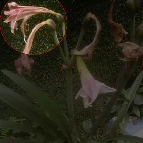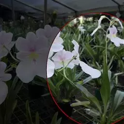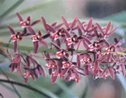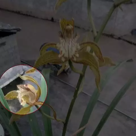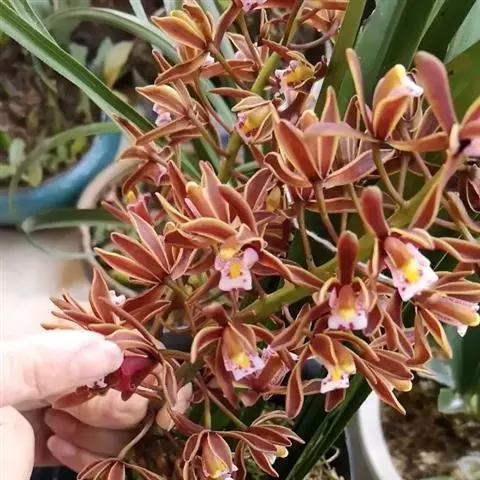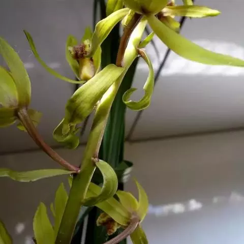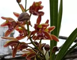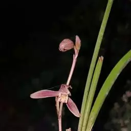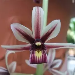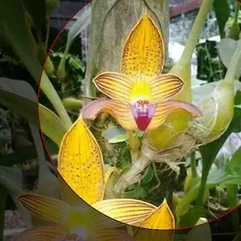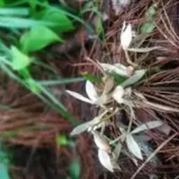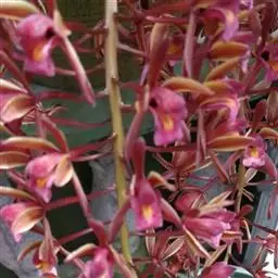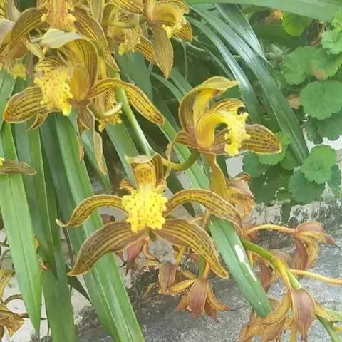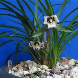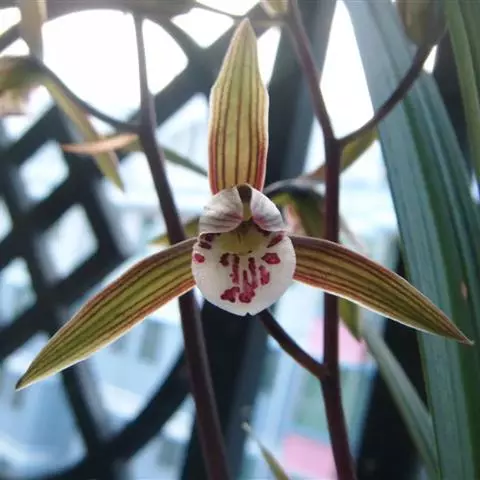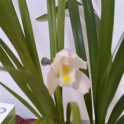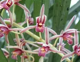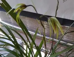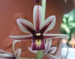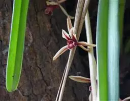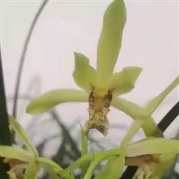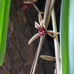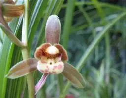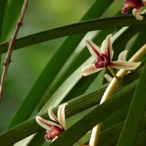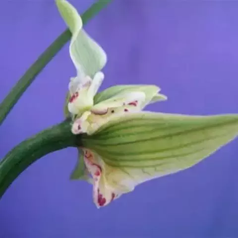 花葶从假鳞茎下部侧面节上发出,直立,长8-20厘米或更长;花序具2-6朵花,较少减退为单花或具更多的花;花苞片披针形,长1-1.5厘米;花梗和子房长2-2.5厘米;花通常白色至淡绿色,花瓣上有紫栗色中脉,唇瓣上有紫栗色斑;萼片倒披针状长圆形,长2.2-2.7(-3)厘米,宽5-7毫米。
