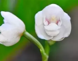 假鳞茎卵球形或长圆形,长1-1.3厘米,直径约1厘米,彼此较密接,具节,多少具撕裂成纤维状的残留鞘。叶2枚,生于假鳞茎顶端,线状披针形或狭披针形,基部收狭成柄,连柄长达17厘米,上部宽5-7毫米。花葶从假鳞茎侧面或近顶端处发出,长20-30厘米,中下部有2-3枚筒状鞘;总状花序长4-6厘米,具8-12朵花;花苞片卵状披针形,长1.5-3毫米;花梗和子房长6-9毫米;花白色;萼片长圆状披针形,长5.5-6毫米,宽1.5-2毫米,先端近急尖;侧萼片略斜歪;花瓣披针形或线状披针形,长5-5.5毫米,宽约1.2毫米,先端短渐尖;唇瓣轮廓近长圆状倒卵形,长约5毫米,近基部3裂,基部有短爪,无囊;侧裂片近线形,长约1.5毫米;中裂片倒卵形或宽倒卵形,边缘有不规则缺刻,略呈皱波状,有时先端有凹缺;唇盘上在两枚侧裂片之间有1枚线形的、中央有纵槽的胼胝体,延伸到中裂片下部;蕊柱长约2.5毫米,略向前弯。蒴果椭圆形,下垂,长1-1.2厘米,宽约5毫米。花期6月,果期不详。
