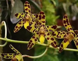 假鳞茎卵球形或其他形状,长2-3厘米,宽0.7-2厘米,密接,具2-3节。叶1枚,生于假鳞茎顶端,线形,长可达40厘米。花葶从假鳞茎侧面发出,长达50厘米,具3-4枚鞘;总状花序长约14厘米,具15-20朵花;花苞片小,长约5毫米;花梗和子房长约9毫米,褐色;花张开,暗褐色,但唇瓣白色,背面黄色,中裂片有红褐色斑;萼片狭长,长8-8.5毫米,宽2-3毫米;花瓣亦狭长,长约8毫米,宽1.5毫米,先端急尖;唇瓣长6.5毫米,向基部渐狭,近中部3裂,无明显的爪;侧裂片狭窄,多少围抱蕊柱,长约5毫米,先端钝;中裂片外弯,长约3.8毫米,宽3.2毫米,先端近截形,边缘波状;唇盘上在两枚侧裂片与中裂片之间有1个黄色的、中央有纵槽的宽阔胼胝体;胼胝体长达2.5毫米,与中裂片基部近等宽;蕊柱长4毫米,圆柱形。花期5-6月。