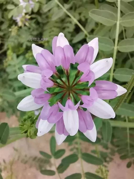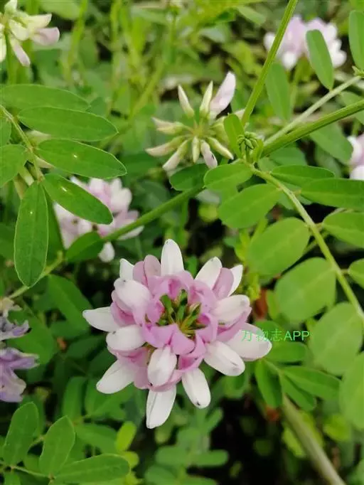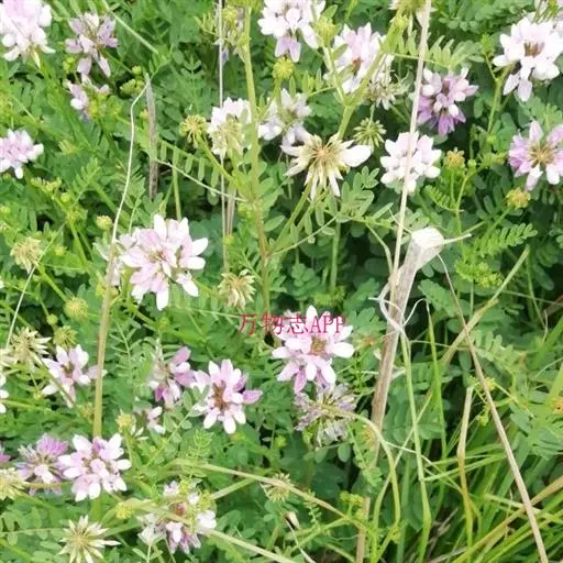 绣球小冠花(学名:Coronilla varia Linn.)是豆科,小冠花属多年生草本植物,茎直立,粗壮,多分枝,疏展,高可达100厘米。髓心白色,奇数羽状复叶,托叶小,膜质,披针形,叶柄短,小叶片薄纸质,椭圆形或长圆形,两面无毛;小脉不明显;小托叶小;小叶柄无毛;伞形花序腋生,花密集排列成绣球状,苞片披针形,宿存;花梗短;花萼膜质,萼齿短于萼管;花冠紫色、淡红色或白色,旗瓣近圆形,翼瓣近长圆形;龙骨瓣先端成喙状,喙紫黑色,荚果细长圆柱形,各荚节有种;种子长圆状倒卵形,6-7月开花,8-9月结果。