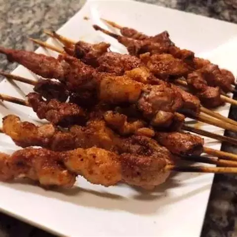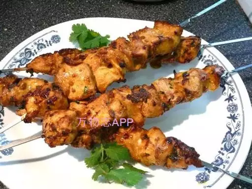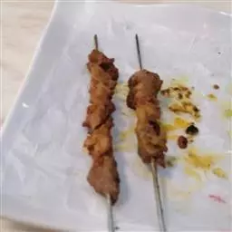 1.羊肉切成小块(每块10克,即约切成25块),用胡椒粉、盐、醋、洋葱末腌2小时,然后穿在短竹扦上,共穿5串;