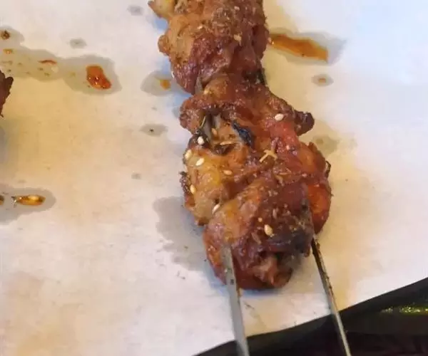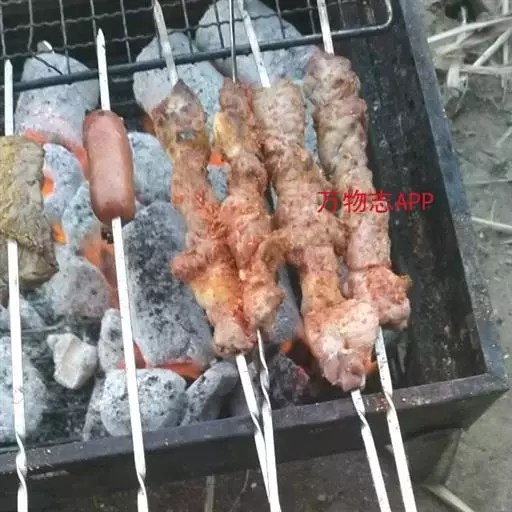2.将裹匀稠糊状调味料的小块羊肉,用手捏扁穿在竹签上(每串可穿8~10个)。 3.将羊肉串横架在点燃、煽旺的炭烤炉上,边煽边烤,待羊肉串两面烤至出油时即熟(喜食辣味,可稍洒辣椒粉)。