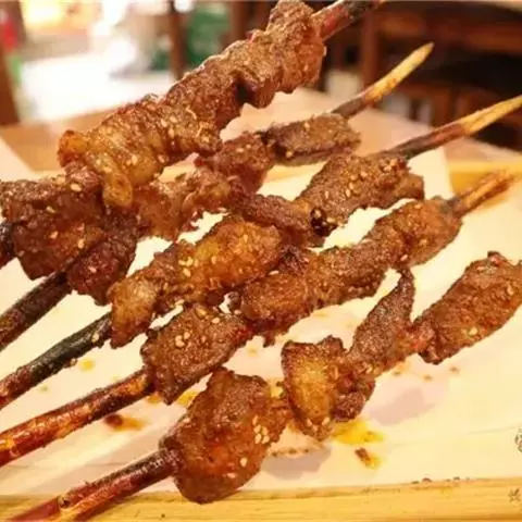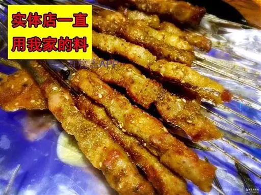 原料配方:瘦羊肉500克、精盐15克、胡椒粉5克、芝麻50克、小茴香3克、孜然5克、花椒粉5克、面粉15克 味料(辣椒粉)少许。