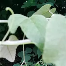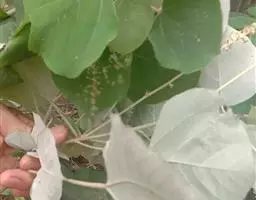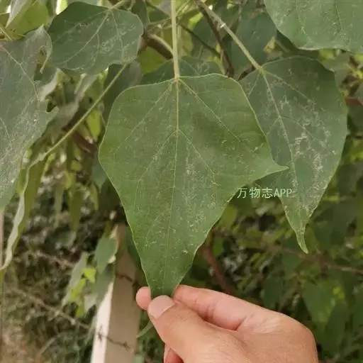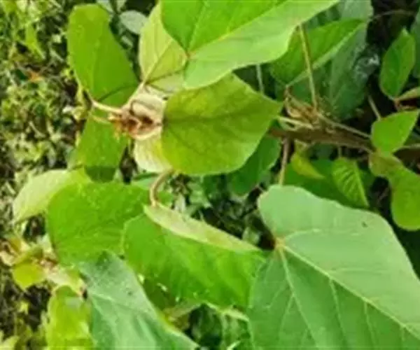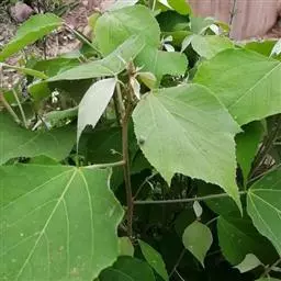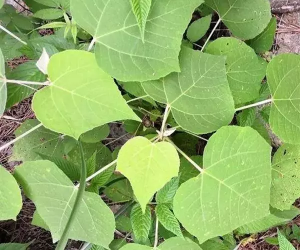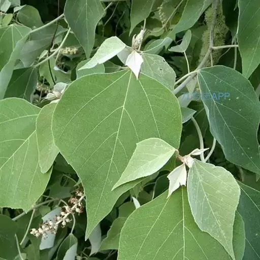 叶:本品皱缩,边缘多内卷,完整叶片展平后呈圆卵形,长7-14cm,宽4-14cm,上表面绿色或黄绿色,下表面灰白色或白色,顶端渐尖,基部略呈心形或近平截,具2腺点,全缘或顶部微3裂,有钝齿,上表面无毛,下表面被星状毛;基出脉3条,叶脉于下表面隆起。叶基具2斑状腺体。叶柄长5-15cm,质脆。气微香,味微苦、辛。