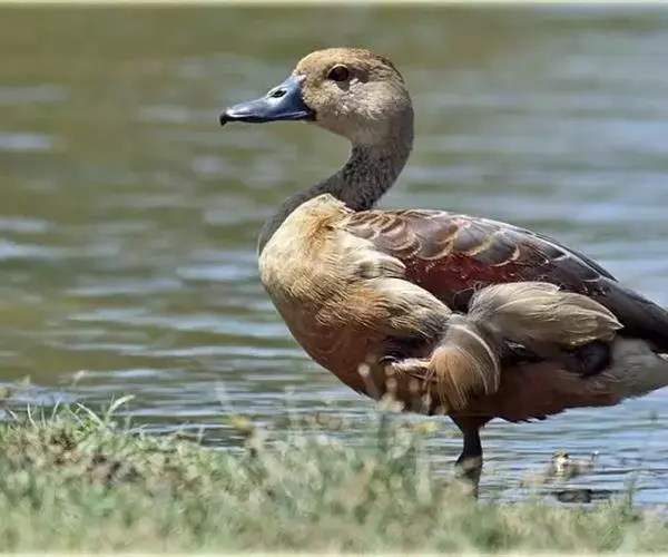 栗树鸭属中小型鸭类,上体主要为黑褐色,尾上覆羽、下胸和腹栗色,眼具狭窄的黄色眼圈,脚较长,嘴、脚均为黑色,颈亦较长。外形似鹅。飞翔时栗红色的翅上、尾上覆羽与黑色的飞羽、尾羽形成鲜明对照,脚亦远远伸出于尾外。两性相似。额浅棕色。头顶、枕部棕褐色,具黑褐色细纹,形成一条黑色带斑从枕部一直延伸到后颈。背、肩黑褐色,具棕色或棕灰色羽缘。腰黑色,有时亦具窄的棕灰色羽缘。尾黑色,尾上覆羽和中、小翅覆羽栗红色,大覆羽及飞羽黑褐色。两颊、前颈灰皮黄色,颏、喉近白色。上胸黄棕色,下胸、腹及两胁浅栗色,但后者杂有黄棕色,尾下覆羽棕白至乳白色。