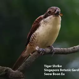虎纹伯劳:全长165毫米左右。雄性成鸟:额基、眼先和宽阔的贯眼纹黑色;前额、头顶至后颈蓝灰色;上体余部包括肩羽及翅上覆羽栗红褐色,杂以黑色波状横斑;飞羽暗褐色,外翻具棕褐色羽缘;尾羽棕褐色,具不明显的褐色横斑,外侧尾羽端缘棕白色;下体纯白色,两胁略沾蓝灰色;覆腿羽白杂以黑斑。雌性成鸟羽色与雄鸟相似,但前额基部黑色较小,眼先及过眼黑纹沾褐,头顶灰色及背羽的栗褐色均不如雄鸟鲜艳;胁部缀以黑褐色鳞状横斑。一般栖息于树林、分布自平原至丘陵、山地,喜栖于疏林边缘以及巢址选在带荆棘的灌木及洋槐等阔叶树。性格凶猛,常停栖在固定场所,寻觅和抓捕猎物。主要食物是昆虫,特别是蝗虫、蟋蟀、甲虫、臭虫、蝴蝶和飞蛾,也吃小鸟和蜥蜴。分布于亚洲多国,该物种的模式产地在印度尼西亚爪哇。