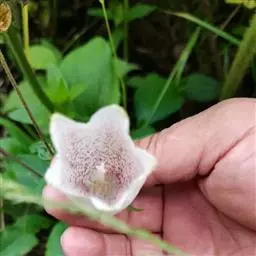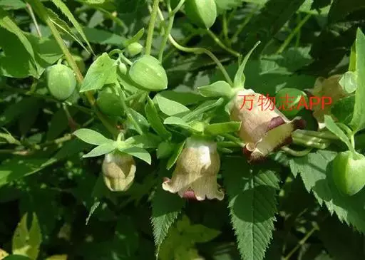 花单生于枝端,与叶柄互生或近于对生,有梗。花萼贴生至子房中部,筒部半球状,裂片宽披针形或狭矩圆形,长1-2厘米,宽约6-8毫米,顶端钝或微尖,微波状或近于全缘,其间湾缺尖狭;花冠上位,阔钟状,长约1.8-2.3厘米,直径1.8-2.5厘米,黄绿色,内面有明显紫斑,浅裂,裂片正三角形,端尖,全缘;花丝基部微扩大,长约5毫米,花药长形,长5-6毫米;柱头有白色刺毛。蒴果下部半球状,上部短圆锥状。种子多数,卵形,无翼,细小,棕黄色,光滑无毛。花果期7-10月。
