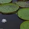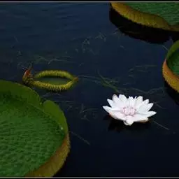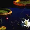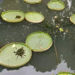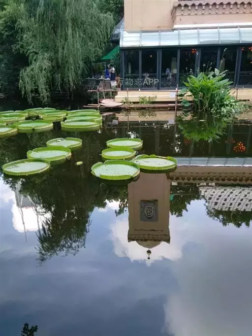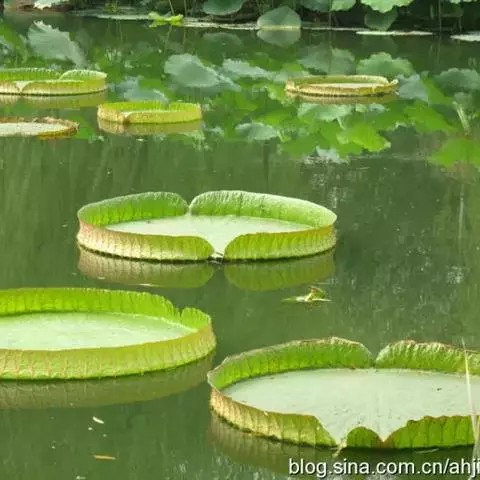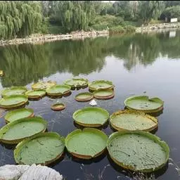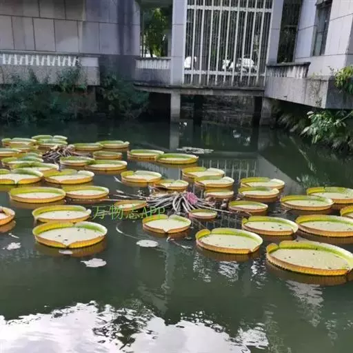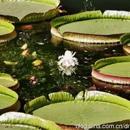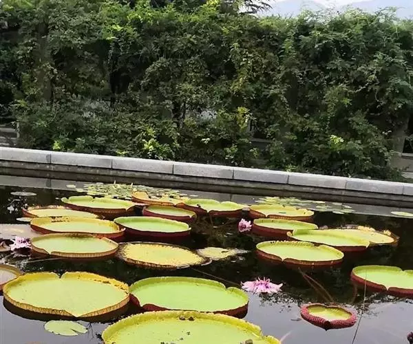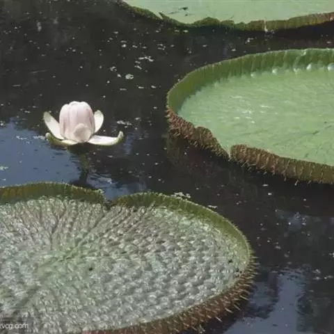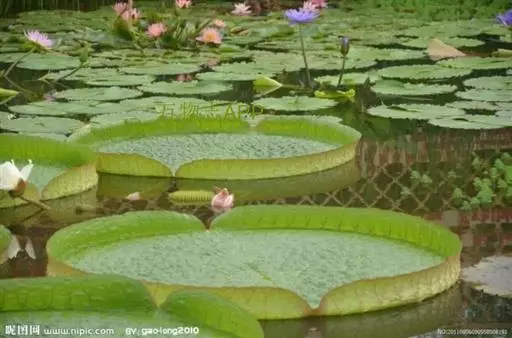 王莲是水景园中的瑰宝,口十片为圆形,叶片边缘向上卷曲,整个叶面浮于水面,十分奇特。王莲的单花花期仅三天,每天的颜色还不相同,开花时花蕾伸出水面,第一天开白色并伴有芳香,第二天变为粉红色,第三天则变为紫红色,然后闭合沉入水中,种子在水中成熟。 王莲主要有‘克鲁兹’王莲和‘亚马逊’王莲2个栽培种,‘克鲁兹’王莲的耐寒性、抗逆性较‘亚马逊’王莲强,栽培也较为容易,北方地区多引种 和栽培此种。‘克鲁兹’王莲叶片直径1.5m~1.8m,边缘直立可达10cm~15cm,叶背叶脉呈深红色,一般于8月中旬至9月开花。