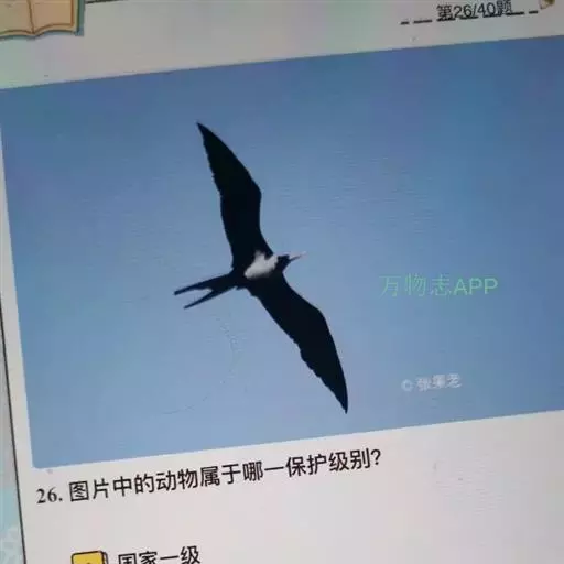 白腹军舰鸟是军舰鸟中最珍贵的种类,繁殖于印度洋的圣诞岛,在热带东印度洋游荡,有时可进入中国南海,是中国的一级重点保护动物。