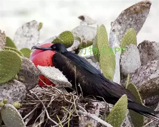 军舰鸟也不是从不到陆地上生活,同时也是食腐鸟和一般 阿岛军舰鸟(图5) 的食肉鸟,经常捕捉小海龟和其他小鸟。它们还很讲卫生,每次吃完东西,都会降落在海面上清洗一下。雄军舰鸟繁殖期间,它的喉囊会变成鲜艳的绯红色,并且膨胀起来。雌鸟产下一枚蛋后,雄鸟的喉囊才慢慢瘪下去,颜色也变回暗红色。