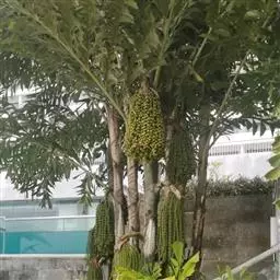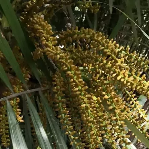 雄花序可长达1.5米,具3-5个分枝,长约35厘米或更长,每分枝掌状分裂为1-3个小穗轴,小穗轴略圆柱状,顶端稍狭,长约25厘米;雄花小,多数,黄色,着生于小穗轴上小苞片的凹穴里,萼片3,下部合生,花瓣较短,匙形,雄蕊6,花丝与花冠合生成梗状,花药大,长圆形;雌花序长约80厘米,约有4个分枝,长30-50厘米,粗壮,小穗轴长20-25厘米,雌花较大,球形,直径约2.5厘米,每小穗轴约有8-16朵花,螺旋状排列,退化雄蕊6-9。果实大,近球形,压扁,直径10-15 (-20)厘米,外果皮光滑,黑褐色,中果皮纤维质,内果皮由3(-l)个硬的分果核组成,包着种子。种子通常3颗,胚乳角质,均匀,中央有1空腔,胚近顶生。