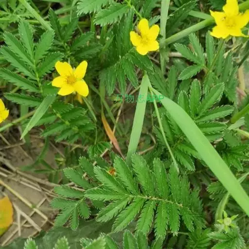 蕨麻(学名:Potentilla anserina L.)是蔷薇科、委陵菜属多年生草本植物。根向下延长,有时在根的下部长成纺锤形或椭圆形块根。茎匍匐,在节处生根,常着地长出新植株,外被伏生或半开展疏柔毛或脱落几无毛。基生叶为间断羽状复叶,叶柄被伏生或半开展疏柔毛,小叶对生或互生,无柄或顶生小叶有短柄,椭圆形,倒卵椭圆形或长椭圆形,上面绿色,下面密被紧贴银白色绢毛,叶脉明显或不明显,茎生叶与基生叶相似,单花腋生;花直径1.5-2厘米;萼片三角卵形,副萼片椭圆形或椭圆披针形,花瓣黄色,倒卵形、顶端圆形。