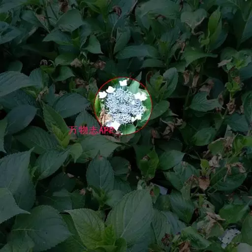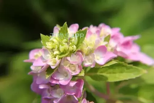 伞房状聚伞花序近球形,直径8-20厘米,具短的总花梗,分枝粗壮,近等长,密被紧贴短柔毛,花密集,多数不育;不育花萼片4,阔物卵形、近圆形或阔卵形,长1.4-2.4厘米,宽1-2.4厘米,粉红色、淡蓝色或白色;孕性花极少数,具2-4毫米长的花梗;萼筒倒圆锥状,长1.5-2毫米,与花梗疏被卷曲短柔毛,萼齿卵状三角形,长约1毫米;花瓣长圆形,长3-3.5毫米;雄蕊10枚,近等长,不突出或稍突出,花药长圆形,长约1毫米;子房大半下位,花柱3,结果时长约1.5毫米,柱头稍扩大,半环状。