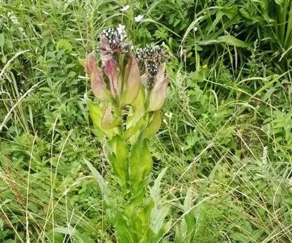 多年生草本,高30-70厘米。根状茎横走,颈部被褐色纤维状或鳞片状叶柄残迹。茎直立,带紫色,被稀疏或稠密的白色长柔毛。基生叶线状长圆形,长20-35厘米,宽1-5厘米。顶端渐尖或长渐尖,基部渐狭成长7-9厘米的叶柄,柄基鞘状,边缘有稀疏的锐细齿,上面被稀疏的长柔毛,下面无毛;茎生叶向上渐小,披针形或宽披针形,顶端渐尖,无柄,基部半抱茎,边缘有稀疏的细齿;最上部茎叶苞叶状,膜质,紫色,椭圆形或宽椭圆形,长5.5厘米,宽1.3厘米,包围总花序。