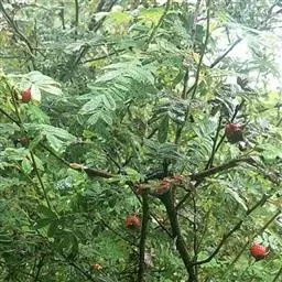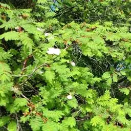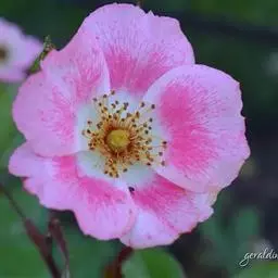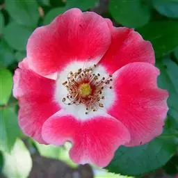 花排列成伞房状,花梗有腺毛,花直径6-8厘米;萼筒光滑,萼片卵状披针形,有羽状裂片,外被腺毛;花瓣单或重瓣,白色或粉红色,有香味。果长圆卵形,长约2厘米,鲜红色,萼片脱落。