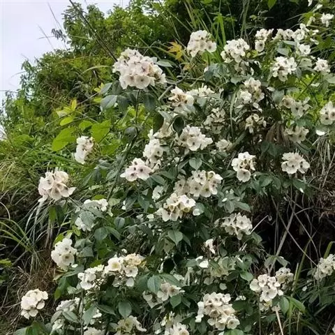白蔷薇系直立灌木植物,高约2米;小枝有不等钩状皮刺,有时混有刺毛。小叶通常5,稀7,宽椭圆形或卵形,稀长圆卵形,长2-6厘米,边缘有单锯齿,下面被毛,托叶宽,半边有锯齿。