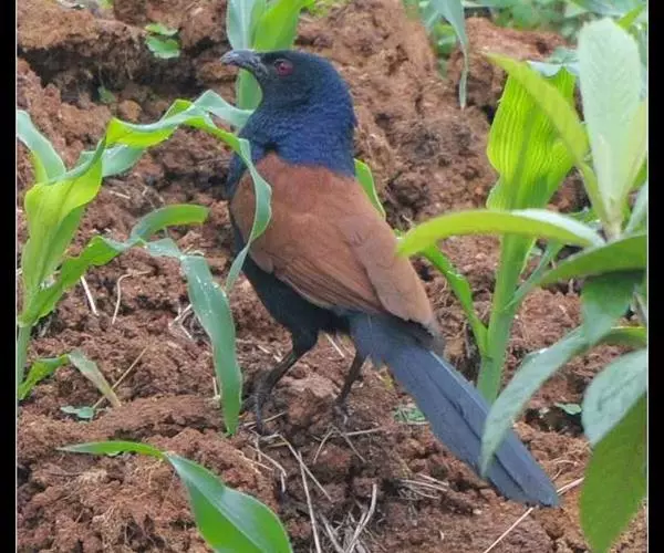 褐翅鸦鹃虹膜赤红色(成鸟)或灰蓝至暗褐色(幼),嘴、脚黑色。