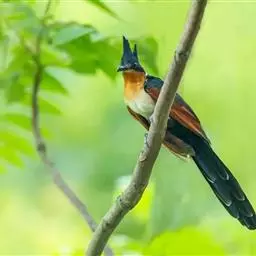 红翅凤头鹃:体长约38厘米,顶冠及凤头黑色,具显眼的直立凤头,背及尾黑色而带蓝色光泽,翅栗红色,…