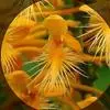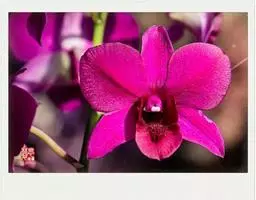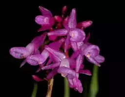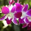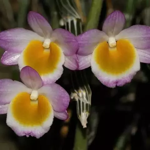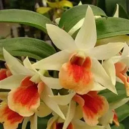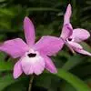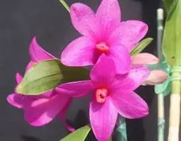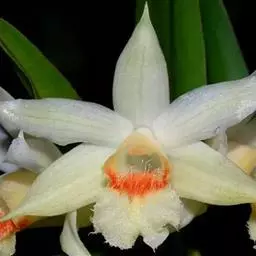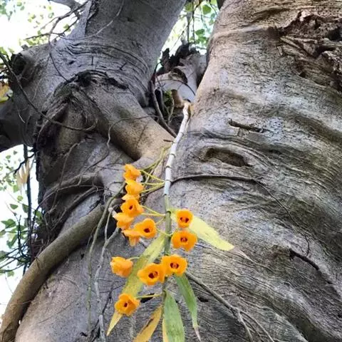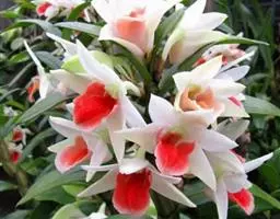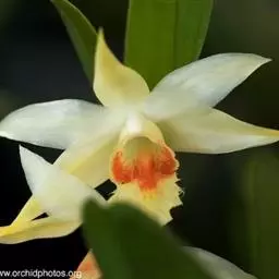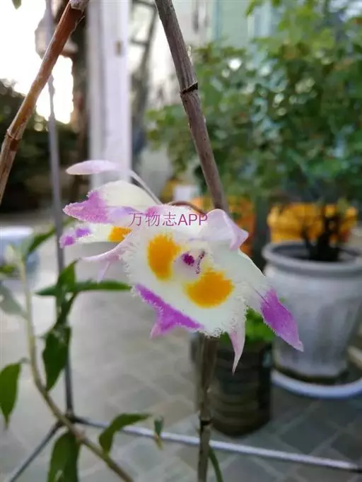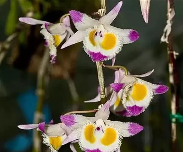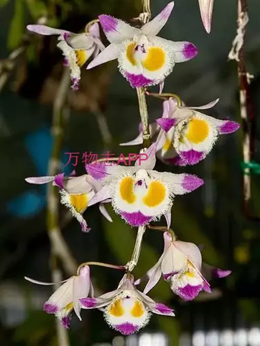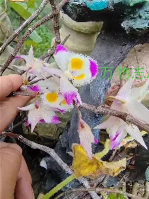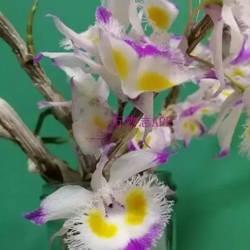 齿瓣石斛(学名:Dendrobium devonianum Paxt.):茎下垂,稍肉质,细圆柱形不分枝,具多数节。叶纸质,二列互生于整个茎上,狭卵状披针形。总状花序常数个,出自于落了叶的老茎上,每个具1-2朵花;花质地薄,开展,具香气;花瓣与萼片同色,卵形,长2.6厘米,宽1.3厘米,先端近急尖,基部收狭为短爪,边缘具短流苏,具3条脉,其两侧的主脉多分枝;唇瓣白色,前部紫红色,中部以下两侧具紫红色条纹,近圆形,长3厘米。花期4-5月。