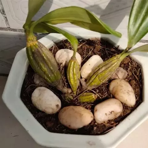 通常选用四壁多孔的塑料或陶瓷花盆,用碳根、泥炭藓、树皮块、木炭块等作盆栽材料。根据兰苗的大小,选择不同规格的花盆,但不宜用大盆栽小苗口上述栽好材料在使用前必需在清水中浸泡1天以上备用。盆底要多垫大瓦片或碎砖块,深度至盆底约1/3处,然后将兰苗放于盆中央,并在一旁插一细竹竿以固定兰苗,再填入其他栽培材料,注意根与根之间用材料隔开。