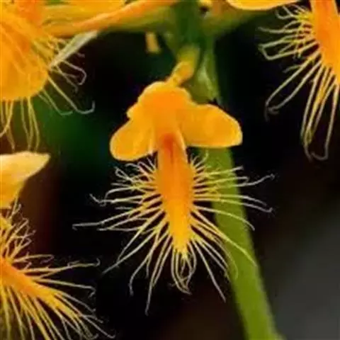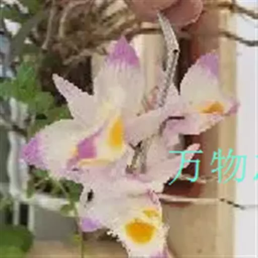 花瓣与萼片同色,卵形,长2.6厘米,宽1.3厘米,先端近急尖,基部收狭为短爪,边缘具短流苏,具3条脉,其两侧的主脉多分枝;唇瓣白色,前部紫红色,中部以下两侧具紫红色条纹,近圆形,长3厘米,基部收狭为短爪,边缘具复式流苏,上面密布短毛;唇盘两侧各具1个黄色斑块;蕊柱白色,长约3毫米,前面两侧具紫红色条纹;药帽白色,近圆锥形,顶端稍凹的,密布细乳突,前端边缘具不整齐的齿。花期4-5月。