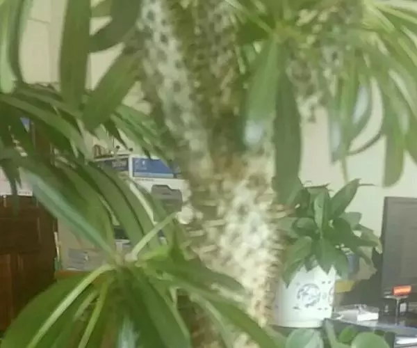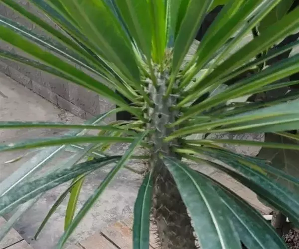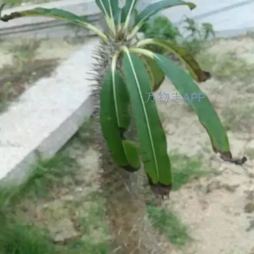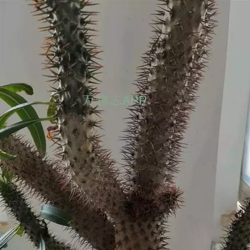 茎干肥大挺拔,高可达5米,直径可达30厘米,圆柱形、褐绿色,密生3枚一簇的银灰色的硬刺,较粗短,长2-6厘米。茎顶丛生翠绿色长广线形叶片,尖头,叶柄及叶脉淡绿色。花白色,中央黄色,直径约5-8厘米,有清香,开花期多在春季至早夏。 非洲霸王树