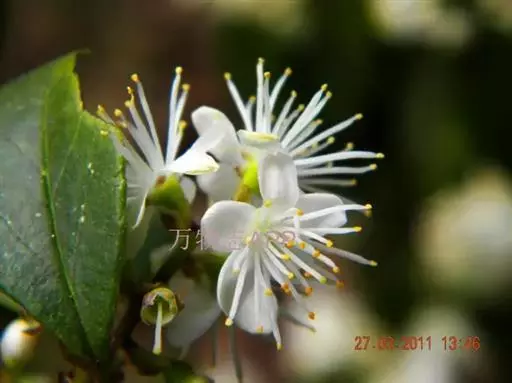 总状花序长2.5-4厘米,被展开的柔毛;苞片早落,阔卵形至倒卵形,长约1毫米,密被柔毛,小苞片与苞片同形;花萼长2-2.5毫米,萼筒倒圆锥形,无毛,裂片三角状卵形,与萼筒等长或稍短于萼筒,背面有微柔毛;花冠白色,5深裂几达基部,长4-4.5毫米,裂片背面有微柔毛;雄蕊25-35枚,花丝基部稍合生;花盘环状,无毛;子房3室。