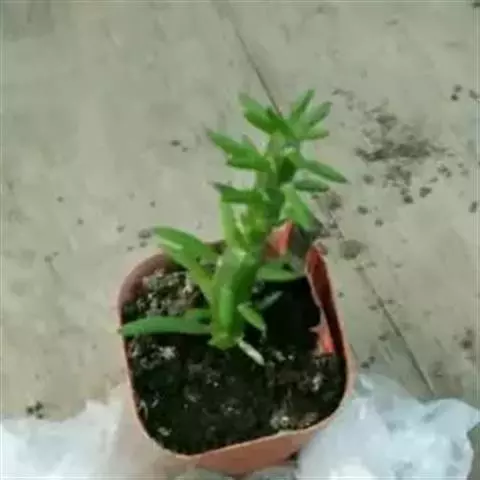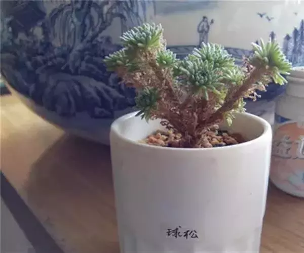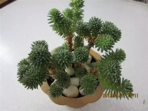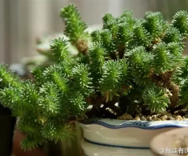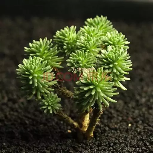 多肉植物,植株低矮,多分枝,株型近似球状,新枝浅绿色,以后逐渐转为灰白色,肉质叶近似针状,簇生于枝头,绿色或灰绿色。枝条下部的老叶容易干枯,贴在枝干上,形成类似松树皮般的龟裂,数月才脱落,露出光滑的肉质茎。小花黄色,星状。 小松绿