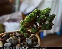 水旱式:小松绿盆景的制作方法与丛林式小松绿盆景相似,但要选用椭圆形或长方形白色汉白玉花浅盆,用白色盆面代替水面,并在合适的位置摆上小船,以使画面具有诗情画意。
