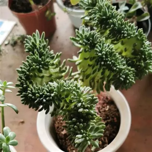 小松绿的萌发力强,容易萌发侧枝, 养护中应及时剪去过密、过乱的枝条, 尤其是基部的新枝,以保持植株的自然美观。对于修剪下来的枝条,可作为插穗进行扦插繁殖。此外,小松绿是以观叶为主的多肉植物,其花的观赏价值不高,出现花序时应及时剪去,以免消耗过多的养分。