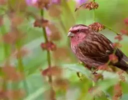 红眉朱雀:体长15厘米,是一种中等体型的朱雀。上体褐色斑驳,眉纹、脸颊、胸及腰淡紫粉,臀近白。…